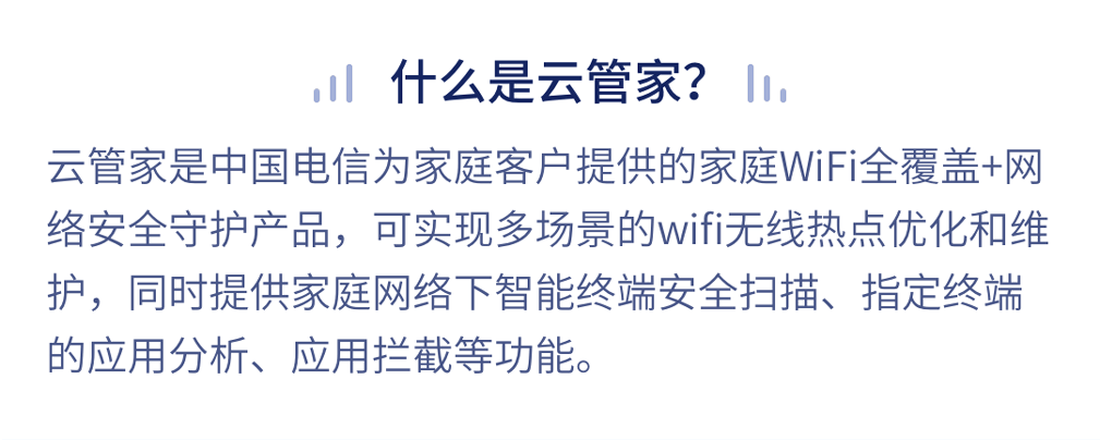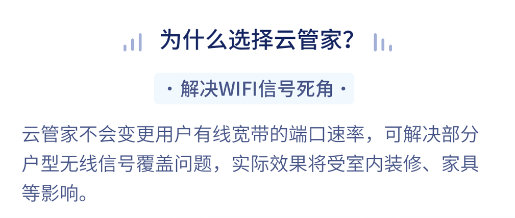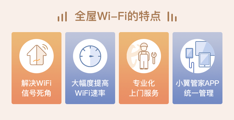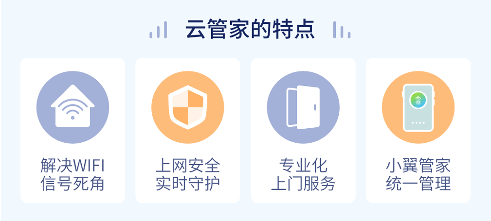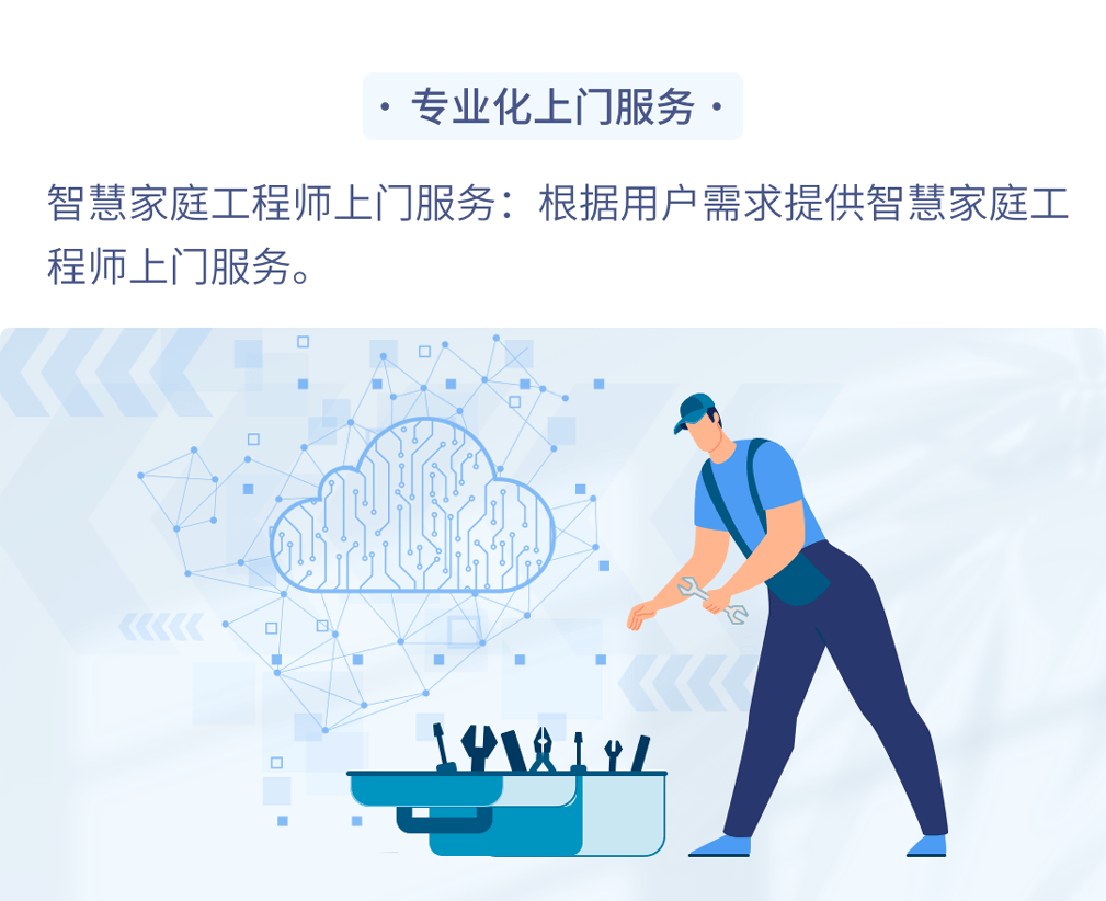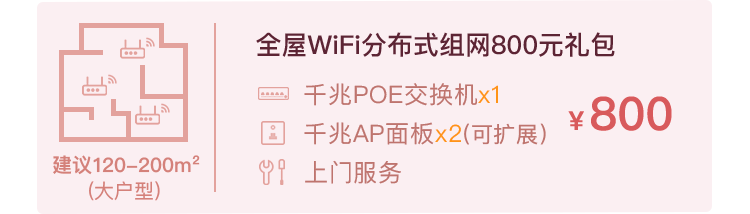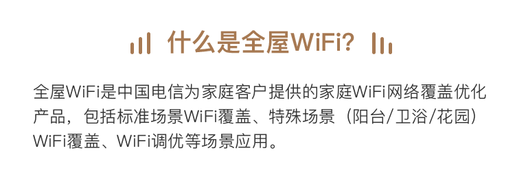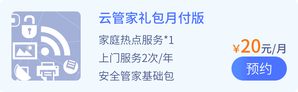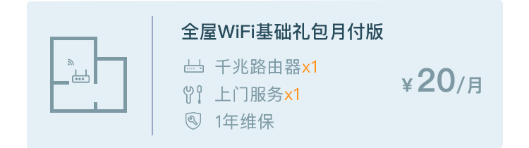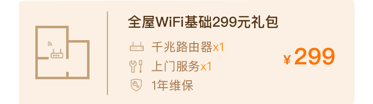 | 全屋WiFi基础礼包 | 费用299元,包含1台千兆无线路由器及智慧家庭工程师上门服务,路由器归用户所有。 | 智家工程师携带上门 | 各地市活动政策有所差异,具体以活动页面展示为准 |