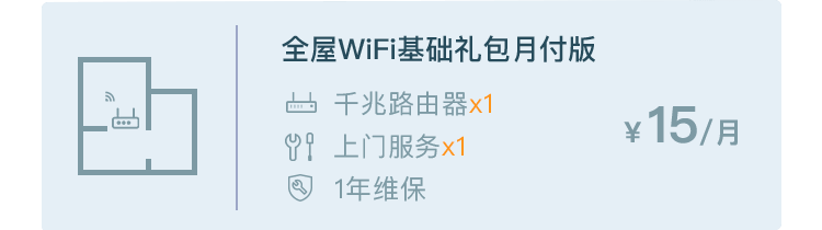 | 全屋WiFi基础礼包月付版 | 费用15元/月,包含1台千兆路由器+上门服务1次+1年维保,该套餐礼包协议期为25个月(含订购当月),若客户在承诺的合约期内发生停机保号、拆机、过户、退订套餐、提前终止合约、以各种方式降低套餐月基本费的情况,视为客户违约。若客户违约,须按“15元*客户未履行月份数”支付违约金。 | ||