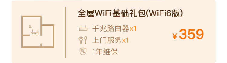 | 全屋WiFi基础礼包(WiFi6版) | 费用359元,包含1台wifi6千兆路由器+上门服务1次+1年维保 | ||